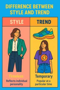 A personal and consistent way of dressing or expressing oneself through clothing, accessories, and overall appearance is known as style. It doesn’t change frequently and help to reflect individual personality and preferences. In short words style means what suits you & stays constant over time.